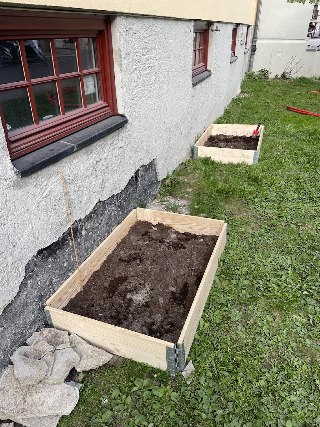 Bortsett fra en liten gressløk og noe timian, har ugress overtatt disse plantekassene inn mot kjellernedgangen til KG6. Noen som vil fjerne ugress og dyrke noe her?